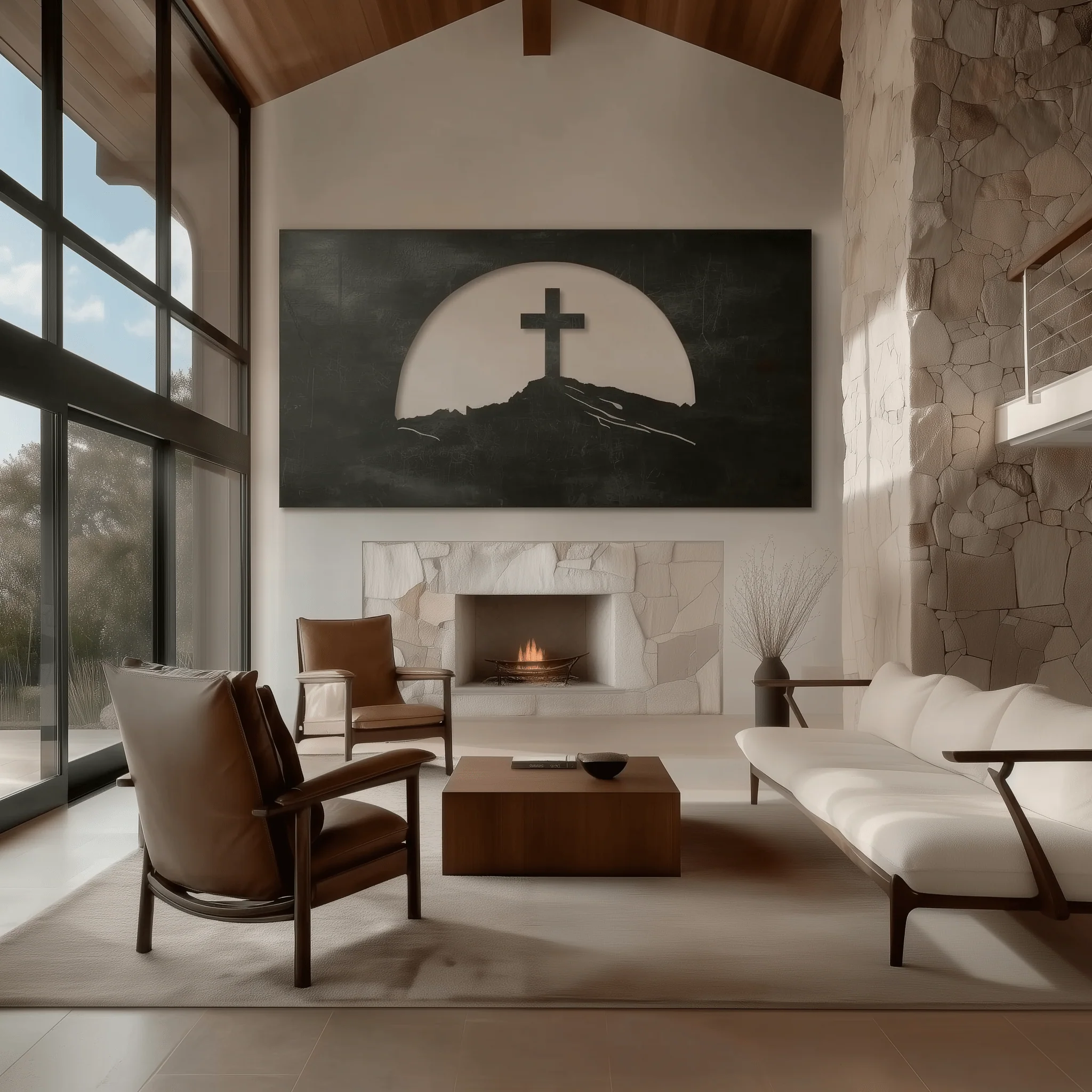 A wide steel cutout captures the cross at day’s end, set against the arc of a descending sun. The Hilltop offers a moment of reflection, where faith and horizon meet in quiet symmetry.