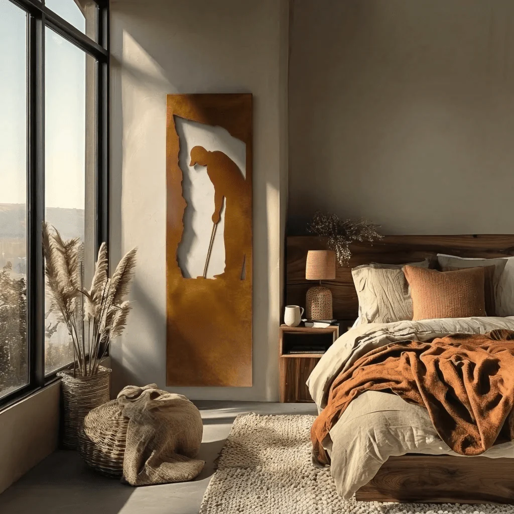 A slender silhouette of a golfer poised over a putt, The Putt captures the stillness and focus of the green in a tall, refined frame.